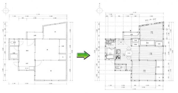 BEFORE&AFTERの図面です!家族が集まるダイニング・キッチンを広く取るために個室を少し狭くしました!!