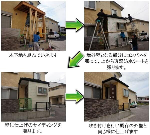 玄関の約1坪分ほどを増築しました!木下地を組み、外壁を仕上げてから、中の工事に移っていきます(・ω・)