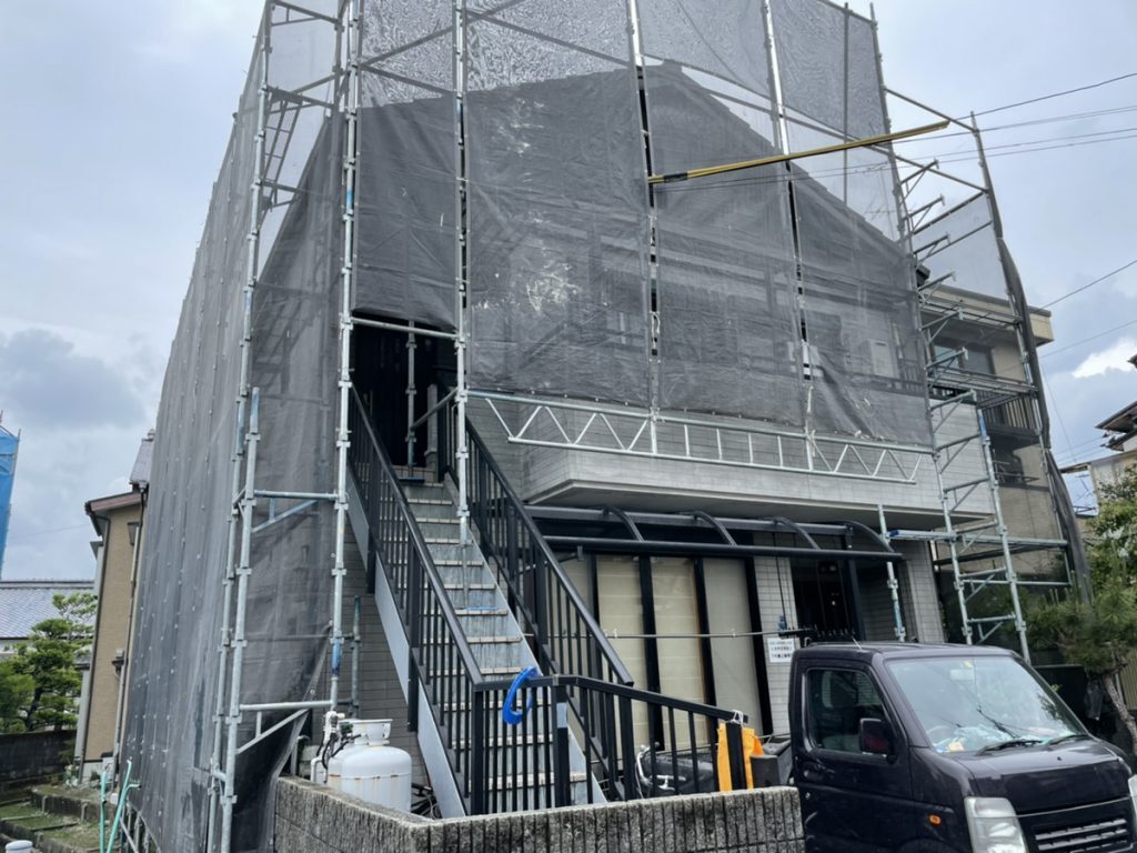 まずは足場の組立を行いました。 ポリカなどが足場の足部分に掛かる場合は。 前もってポリカを外します。