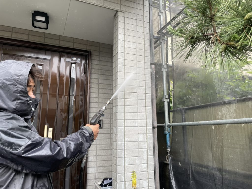 高圧洗浄を行い、外壁についたこけやほこりを洗い流します。