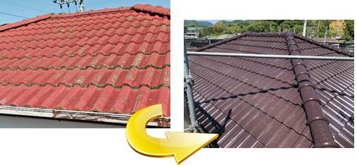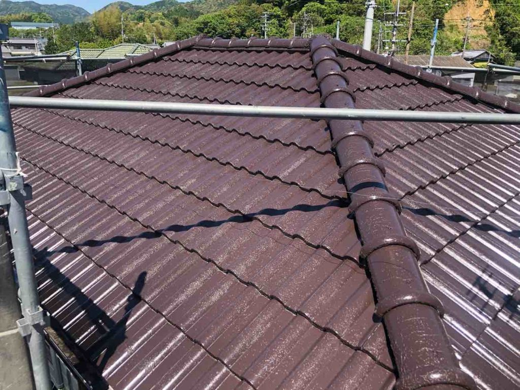 傷みが目立った漆喰も詰めなおし、塗装。ところどころ小さな穴があった瓦にはコーキングを打ちしっかり補修したうえで塗装しています!屋根も艶が出て綺麗になりましたね!
