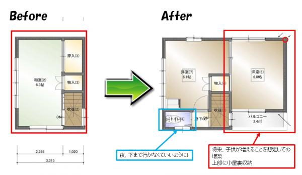 2階のBefore&Afterの図面です。増築することで、今後お子様が増えた時にも対応できるようにしました。また、夜間に下にいかなくてもいいようにトイレと洗面を設けました。