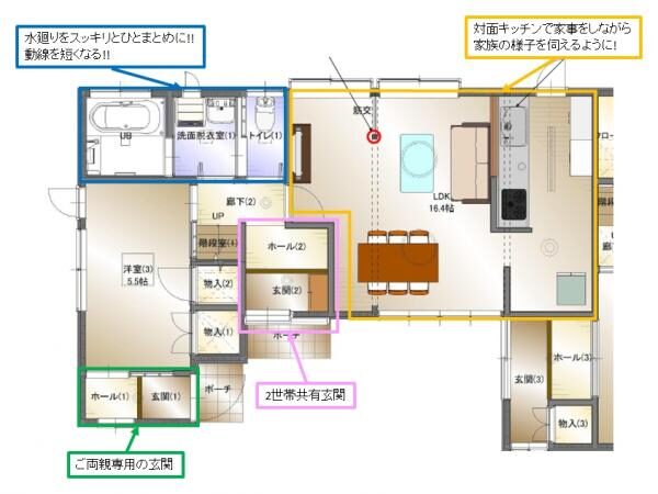 1階のリフォーム後の図面です。水廻りを北側にまとめて配置し、M様にとって使い勝手の良い室の広さを確保しました。いずれ、介護が必要になるかもしれないご両親のために主玄関と別にご両親の部屋から直ぐに出入りできる玄関を設けました。