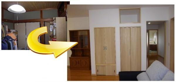 ③左の押入部分は残し、右の壁を撤去して 応接間と和室を一部屋にしました。