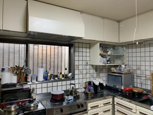 広いL字型のキッチンでしたが、物が多く、収納場所が足りていない様子でした。コンロ前の窓からの西日がまぶしいとのことでした。またガスコンロを使用していました。