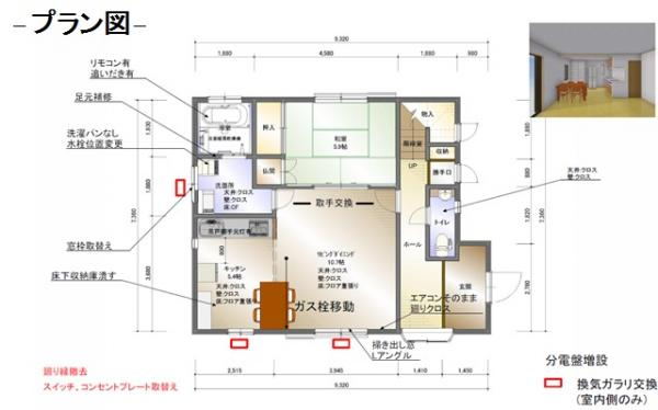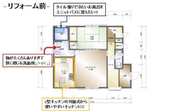 今回、提案させていただいたプランです。L型からI型のキッチンに替えたことで、キッチンと洗面所が近くなり家事動線がスムーズになりました(^_^)V