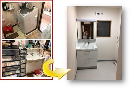 向かいあっていた洗濯機と洗面化粧台を横並びにしたことで、広くスッキリとした場所になりました(^▽^)