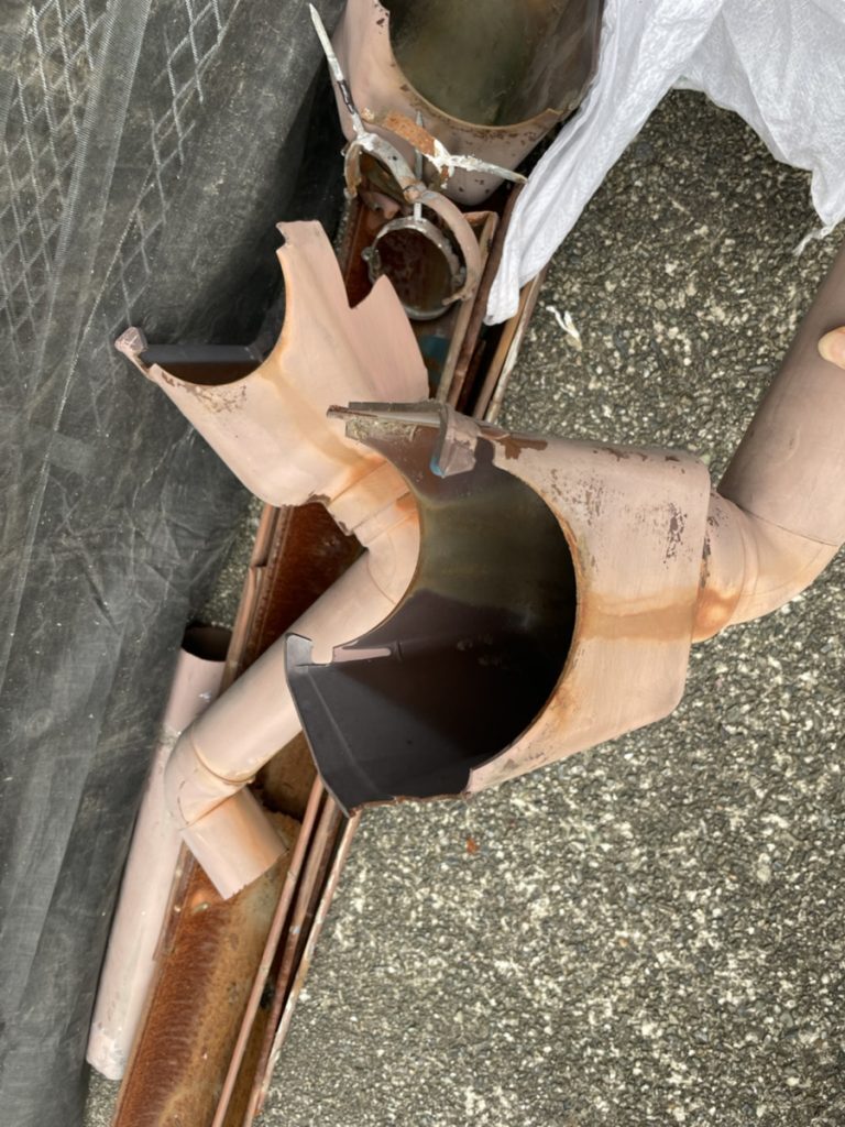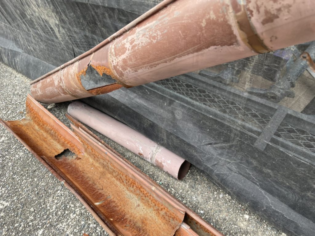 錆て穴が開いた樋を何カ所か切り取り、新しい樋を付け補修しました。 集水器は全て取り換え、樋の竪バンドは錆がひどかったので、全て交換しました。