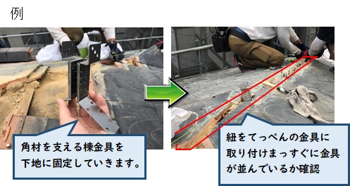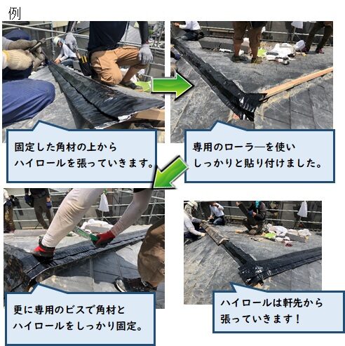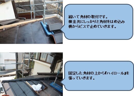 今回は乾式工法という方法で屋根の工事を行いました。漆喰をしようせず金具で固定するのでその分軽量になり、地震の際揺れを軽減することができます。 漆喰の代わりにハイロールというものを使っています。
