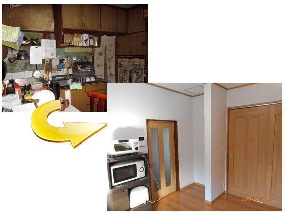 ダイニング部分のBEFORE&AFTERです。袖壁の左横には、冷蔵庫が入ります!