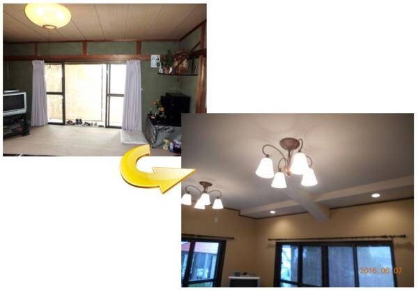 天井が低いのが気になっていたK様。天井を上げましたが、曲がった梁がかかっており、その部分だけアールに曲がるコンパネを下地にして仕上げました!