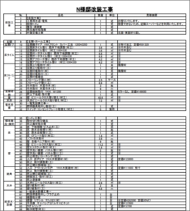 そして、見積書の明細のうちで、予算的に妥協可能な部分は緑色になっていますので、仕様変更によりお客様のご予算に合わせることが可能となります。 十分に、ご納得いただけたら、正式契約、工事着工と進んで参ります。