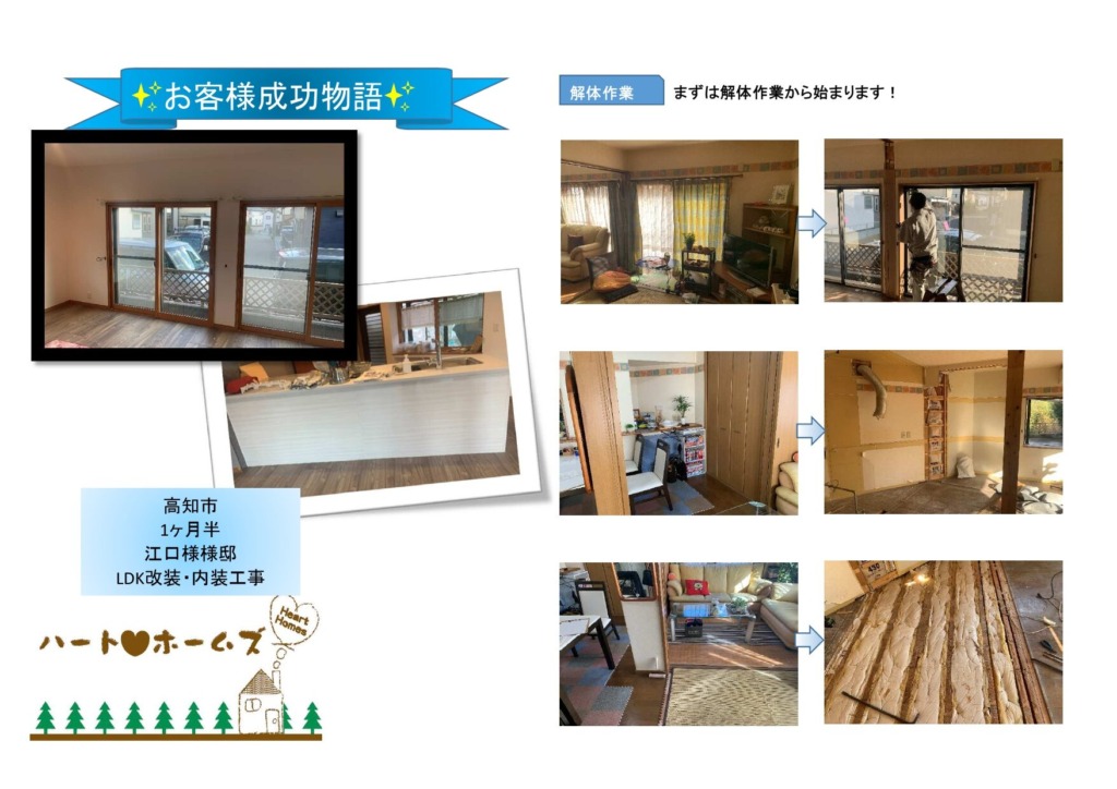 LDKの内装やキッチンなどに不満を感じている時にハートホームズさんとの出会いがあり、ご相談させて頂きました。自分が気づかないところ までヒヤリングしてくれて、詳細な打ち合わせを繰り返し、プランニングを納得いくまでしてもらいました。金額なども不安にあり、詳細な見積もりや減額案を 出してもらい、予算内で素晴らしいリフォームができました。