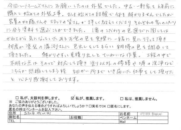 今回ハートホームズさんにお願いしたのは外壁でした。中古・一軒家を6年前に購入し始めての外壁工事。私も始めての経験で何もわかりませんでしたが営業の加藤さんやスタッフの皆さんが詳しく教えて下さりそれぞれの家のパーツに合う塗料を選ぶことができました。