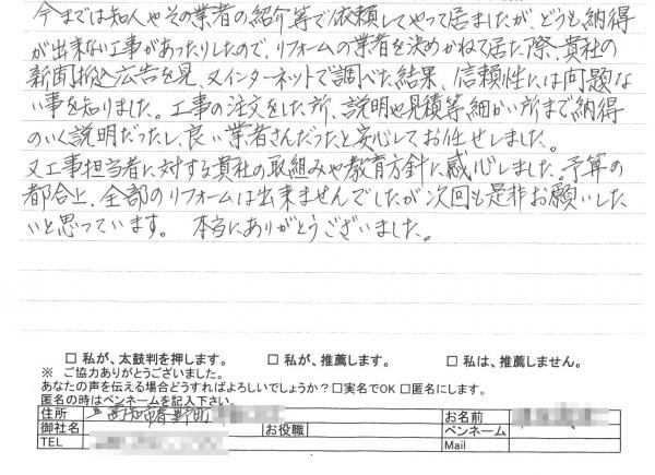 今までは知人やその業者の紹介等で依頼してやっていましたが、どうも納得ができない工事があったりしたので、リフォームの業者を決めかねていた際、貴社の新聞折り込み広告を見、又インターネットで調べた結果、信頼性には問題ないことを知りました。