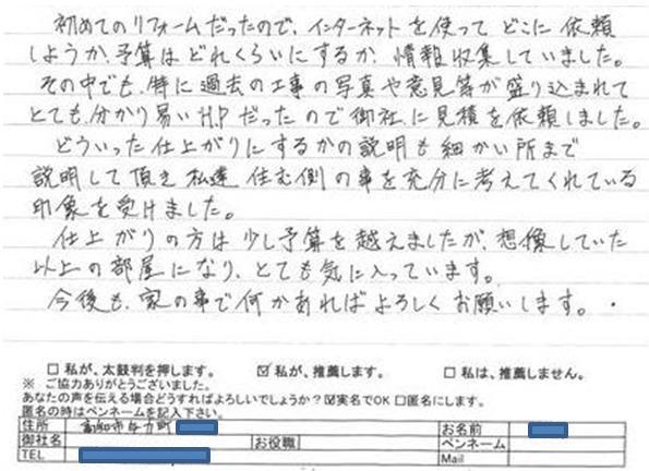 その中でも、特に過去の工事の写真や意見等が盛り込まれてとても分かり易いHPだったので御社に見積もりを依頼しました。